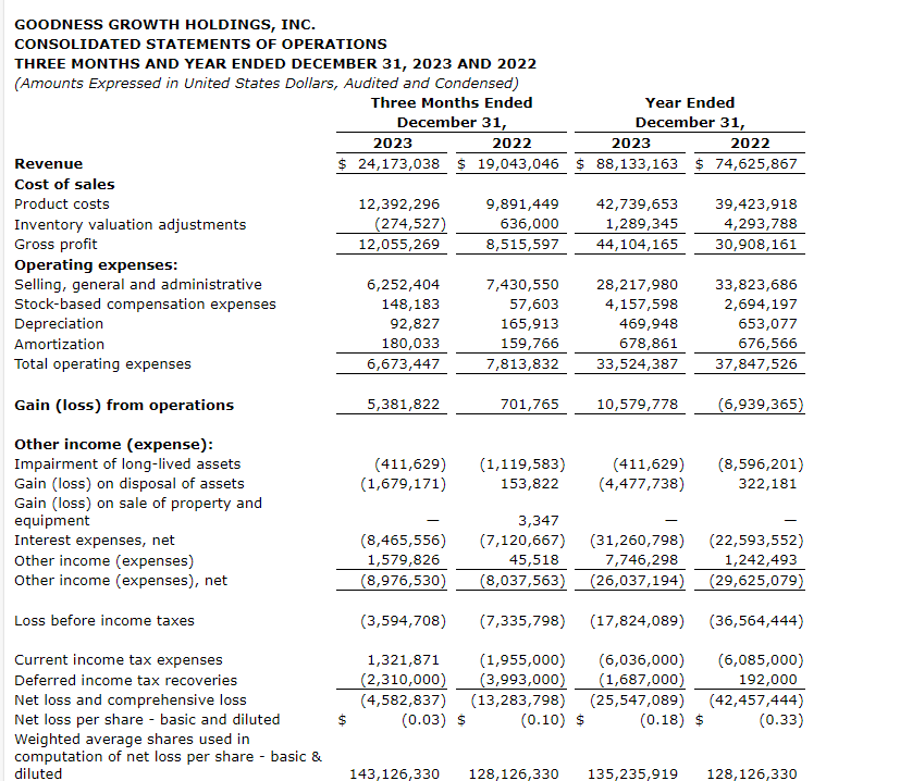 Goodness Growth Holdings Inc. has released financial results for its fourth quarter and full year ended Dec. 31, 2023. Key financial results are presented herein in summary form with supporting commentary and discussion from management of certain key operating metrics which the company uses to judge its performance. All currency figures referenced herein are denominated in U.S. dollars.