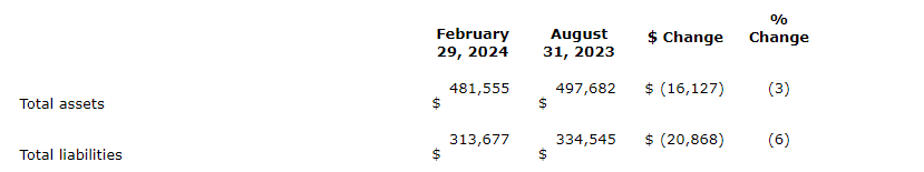 The attached table compares selected financial position information as of Feb. 29, 2024, and Aug. 31, 2023.