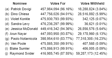 Shareholders of the company voted in favour of all items of business, including the election of each of the director nominees as noted herein.