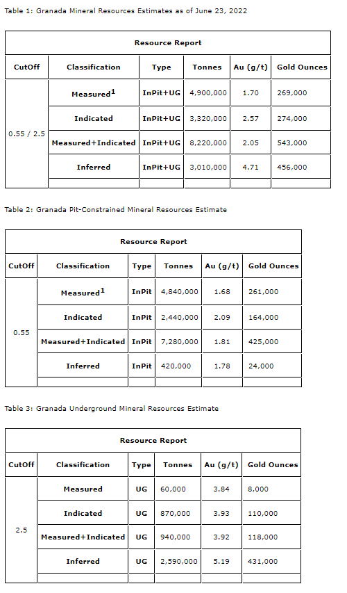 On July 6, 2022, the company released an updated NI 43-101 resource estimate for the Granada gold project (please see July 6, 2022, news release) with a combined total of 543,000 gold ounces in the measured and indicated category and 456,000 gold ounces in inferred. This estimate contains 425,000 gold ounces of combined measured, indicated in pit resources with 24,000 gold ounces of inferred.