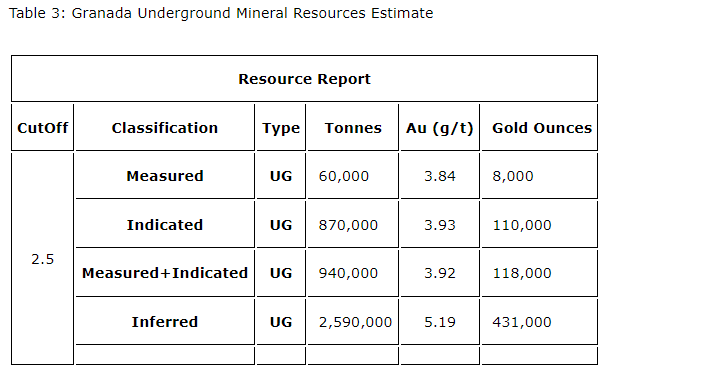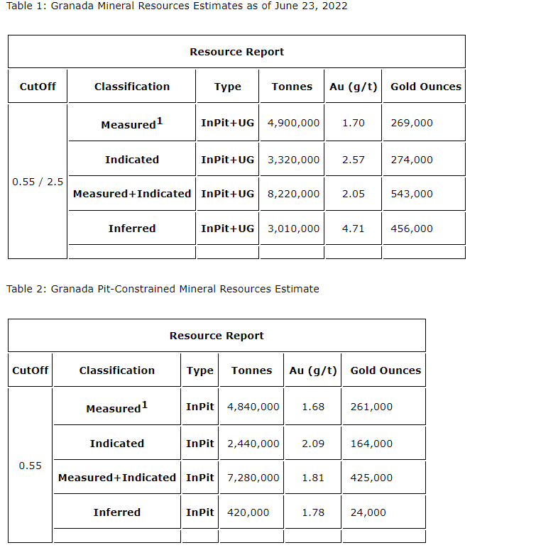 On July 6, 2022, the company released an updated National Instrument 43-101 resource estimate for the Granada gold project (please see July 6, 2022, news release) with a combined total of 543,000 gold ounces of measured and indicated category and 456,000 gold ounces in inferred. This estimate contains 425,000 gold ounces of combined measured, indicated in pit resources with 24,000 gold ounces of inferred. For the underground 118,000 gold ounces of combined measured, indicated, with 431,000 gold ounces of inferred please see the first attached table for full details. Report reference: Granada Gold Project Mineral Resource Estimate Update, Rouyn-Noranda, Quebec, Canada authored by Yann Camus, PEng, and Maxime Dupere, BSc, PGeo, SGS Canada Inc., with an effective date of June 23, 2022, and report date of Aug. 20, 2022.