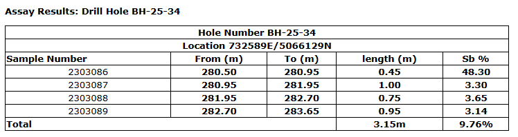 Hole BH-25-34 returned antimony assays of 9.76 per cent antimony over 3.15 metres. This hole extends the Main zone both to the north and to depth.