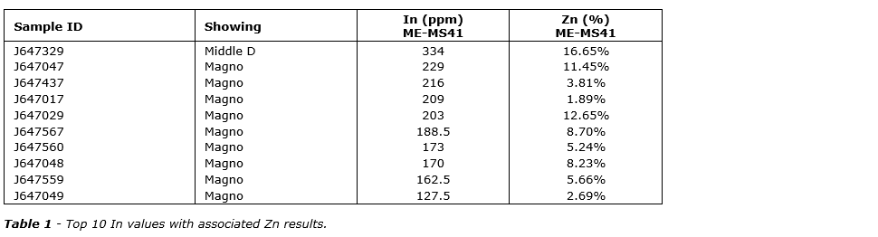 - Indium values of up to 334 parts per million (ppm) returned: assays confirmed above-average crustal background levels (approximately 0.1 ppm), highlighting indium as a meaningful critical mineral component of the Magno system;