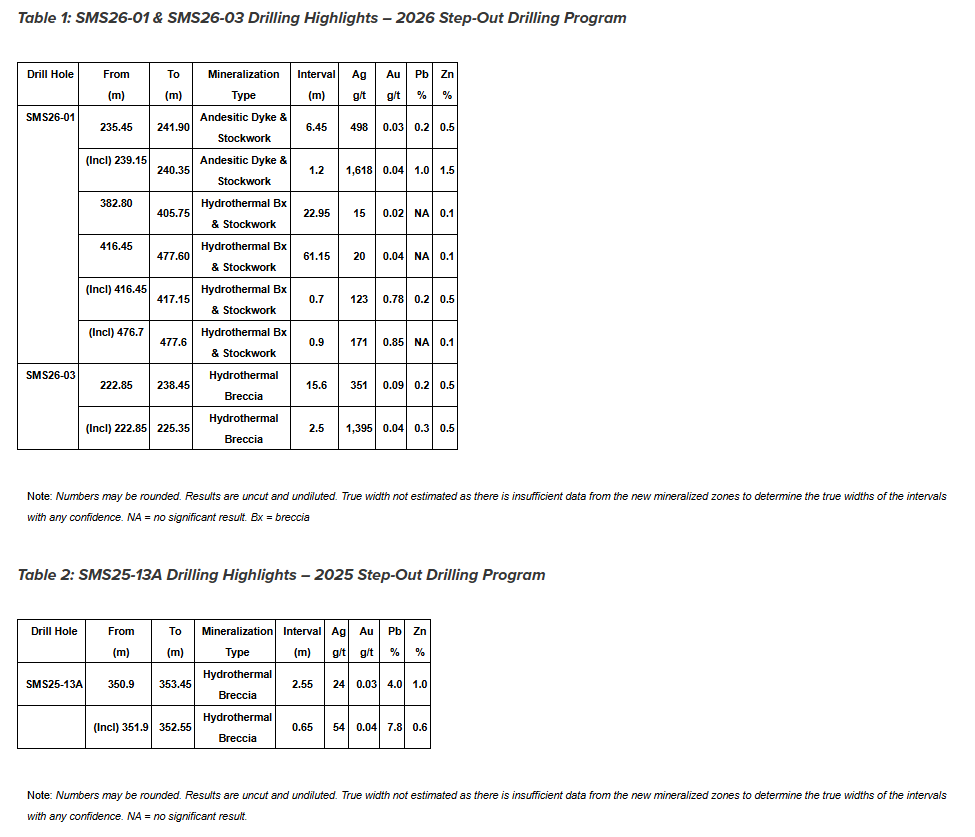 Two silver-mineralized zones were intersected, including multiple intervals of high-grade silver, near the 2023 expansion drilling program, and located on the same cross-section as SMS25-09, which returned 75.2 m at 260 grams per tonne silver (see news release dated Sept. 3, 2025).