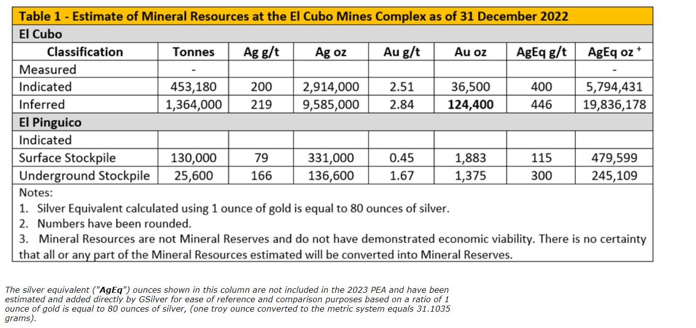 Additionally, the company has identified that the new National Instrument 43-101 preliminary economic assessment report dated June 23, 2023 (effective date: Dec. 31, 2022), titled "Preliminary Economic Analysis -- El Cubo/El Pinguico Silver Gold Complex Project, State of Guanajuato, Mexico," prepared by Behre Dolbear & Company (USA) Inc. as reported and filed on June 26, 2023 (see Guanajuato Silver news release dated June 26, 2023 -- "Guanajuato Silver Provides Updated PEA for the El Cubo Mines Complex"), contained incorrect information with respect to the number of contained gold ounces for the inferred resource at El Cubo and should read 124,400 ounces and not 129,900 ounces as originally reported. Accordingly, tables 1.1 and 14.3 of the 2023 PEA should be amended to reflect the number contained gold ounces for the inferred mineral resource at El Cubo as 124,400 ounces as bolded in the attached table. Such typographical error is confined solely to the above-noted tables in the 2023 PEA and is not material to and did not impact any of the financial metrics or the financial analysis presented in the 2023 PEA as reported on June 23, 2023.