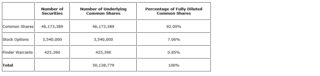 Concurrent with closing of the transaction, the company has: (i) issued 3,540,000 stock options to certain, directors, officers, employees and consultants; and (ii) 425,390 share purchase warrants to finders who introduced investors to the company in respect of the concurrent financing. Other than 500,000 stock options, which are exercisable for two years from issuance and vested immediately, the stock options are exercisable for a period of 10 years from the date of issuance and vest in equal quarterly amounts over two years. Both the stock options and finders' warrants are each exercisable for one postconsolidation common share at a price of 30 cents per common share.