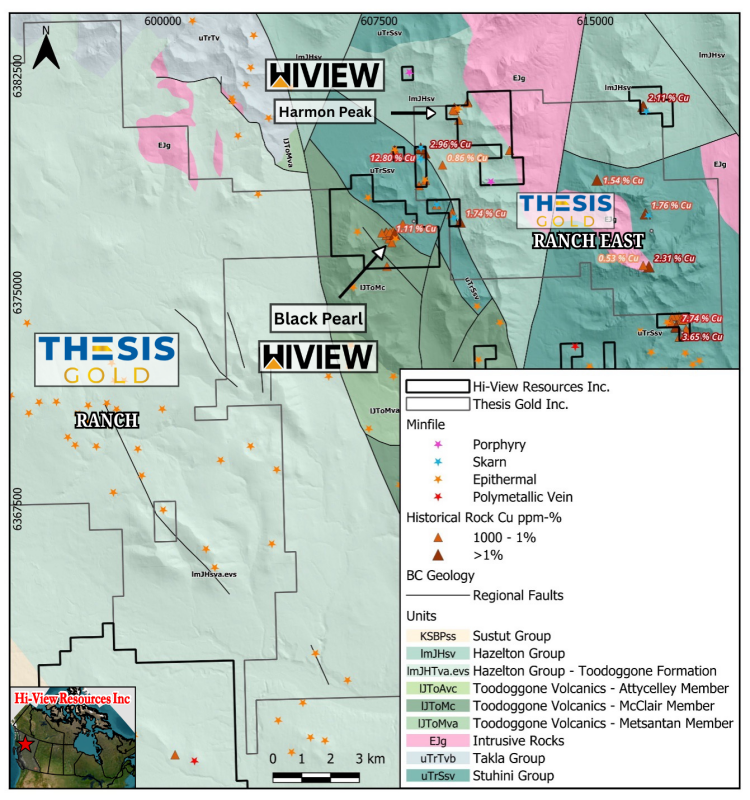 Figure 1. Hi-View’s Black Pearl Flanked by Thesis’s Porphyry Target Locations to the southwest (Ranch) and east (Ranch East)