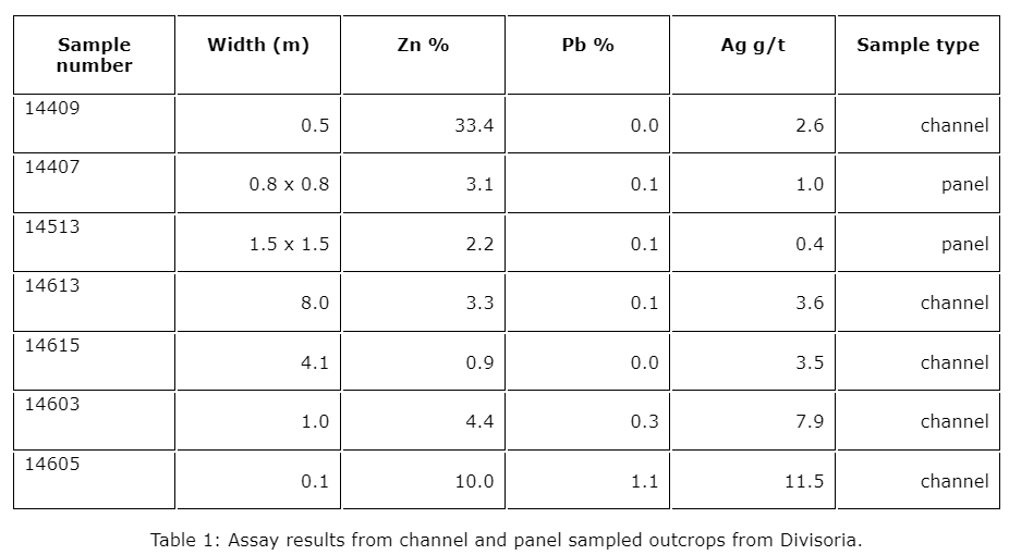 The area with strongest brecciation and veining is exposed for about 300 m width before it disappears under cover. It hosts frequent north-south-trending veins of quartz pyrite and quartz pyrite galena-sphalerite. Locally very-high-grade zinc zones have been analyzed with values up to 33.4 per cent Zn. All veins are younger than the porphyritic country rock and appear to overprint the hydrothermal breccias. Assay results from channel and panel sampled outcrops are summarized in the table entitled "Assay results from channel and panel sampled outcrops from Divisoria."