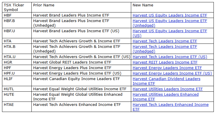 HARVEST ANNOUNCES 'INCOME LEADERS' ETF NAME CHANGES