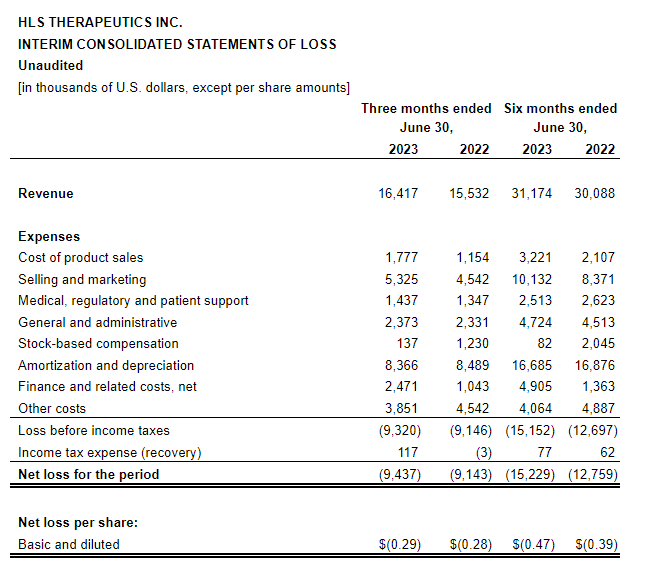HLS Therapeutics Inc. has released its financial results for the three- and six-month periods ended June 30, 2023. All amounts are in thousands of United States dollars unless otherwise stated.