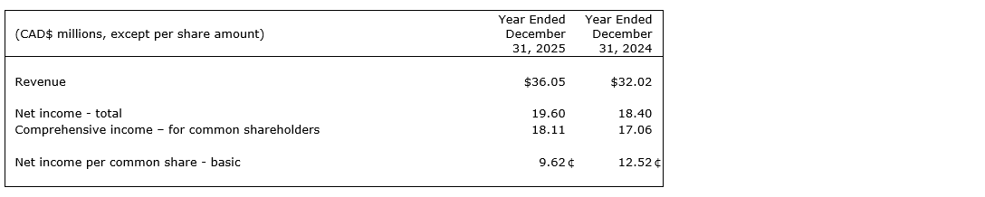 As at Dec. 31, 2025, the fully diluted book value of the company's common shares, assuming the conversion of capital notes and convertible preferred shares, increased to 99 cents per share, compared with 92 cents per share at the prior year-end.