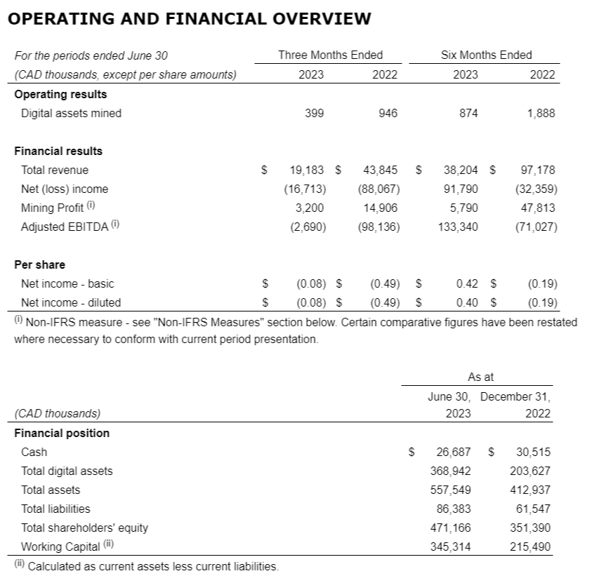 Net loss was $16.7 million and net loss per share was $0.08 for the three months ended June 30, 2023, compared to net loss of $88.1 million and net loss per share of $0.49 for the same period in 2022. The change was primarily driven by the lower non-cash revaluation loss on digital assets recorded to income or loss, partially offset by the lower non-cash gain on revaluation of warrant liability, resulting in lower net loss. Additionally, the net loss per share was lower due to greater weighted average number of shares outstanding for earnings per share purposes under International Accounting Standards 33.