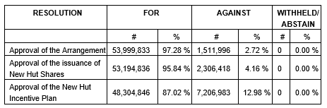 HUT 8 ANNOUNCES VOTING RESULTS FROM SPECIAL MEETING