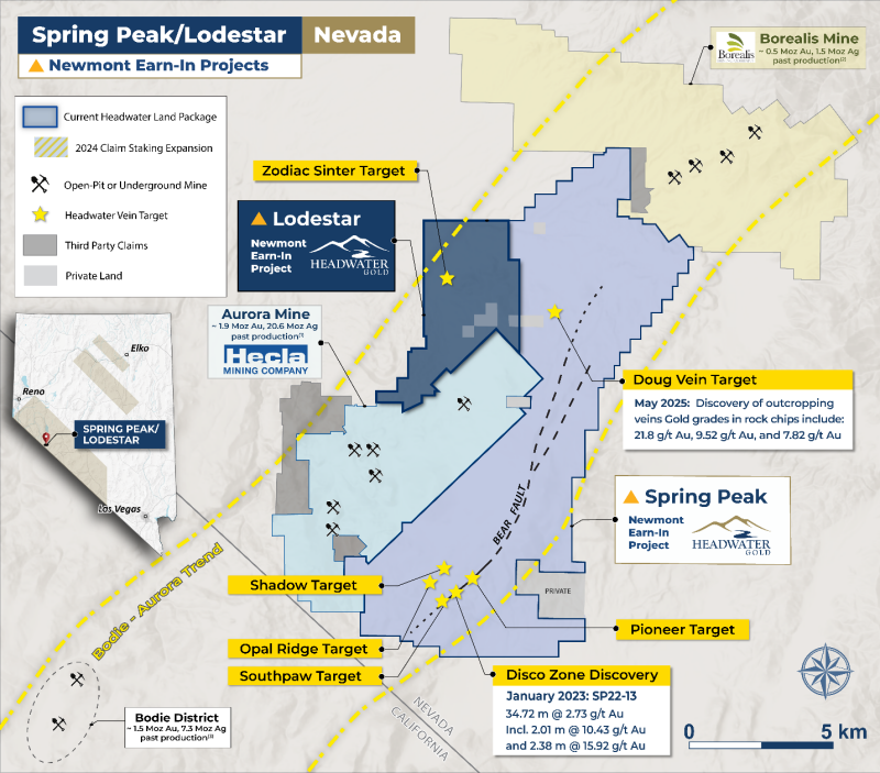 The Lodestar project is located in the Aurora Mining District in the Walker Lane belt, west-central Nevada, approximately 10 km north of Headwater’s Spring Peak project and adjacent to Hecla Mining Company’s past-producing Aurora mine complex, which hosts existing infrastructure including a 600 ton per day mill, several production water wells and high-voltage three-phase power. The project features a prominent silicified and brecciated ridgeline capped by a silica sinter, similar to the sinter overlying the Disco Zone at Spring Peak, where Headwater intersected high-grade gold mineralization, including 15.92 g/t Au over 2.38 m and 10.43 g/t Au over 2.01 m. Historic shallow drilling at Lodestar encountered anomalous gold but did not test deeper feeder structures, leaving exploration potential largely untested. Headwater holds an option to acquire a 100% undivided interest in the Lodestar project from a private vendor, subject to retained royalties and Newmont’s option to acquire up to 75% of the project following certain expenditures and delivery of a Pre-Feasibility Study within a designated time frame.