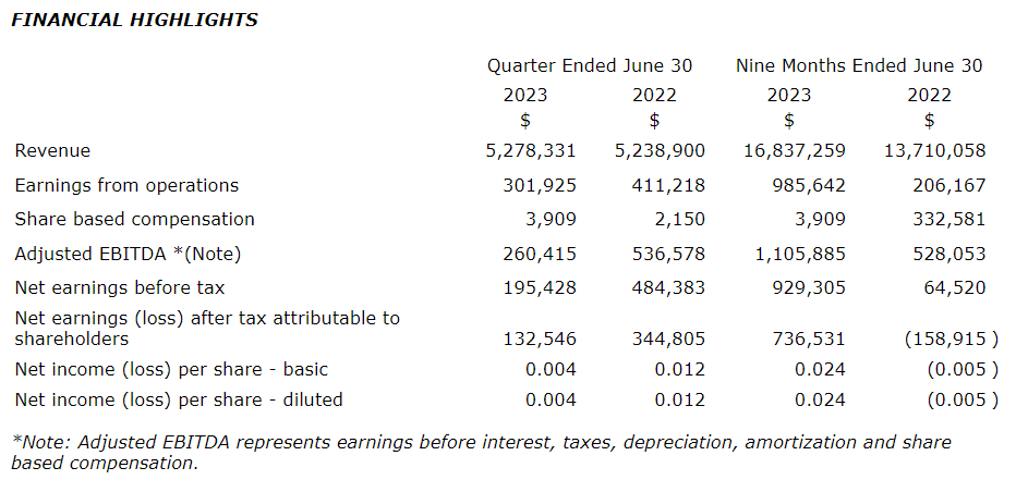 • Total revenues of $16,837,259 for the nine months ended June 30, 2023, compared with $13,710,058 in 2022, representing an increase of $3,127,201, or 23 per cent.