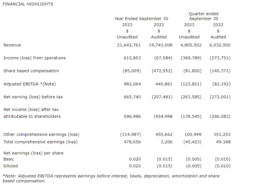 • Cash increased by $1,949,255 to $2,893,980 as at Sept. 30, 2023, from $944,725 as at Sept. 30, 2022.