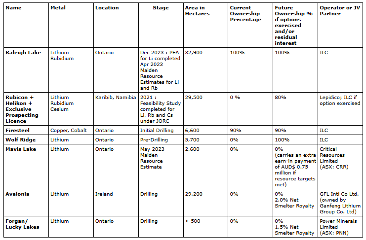 ILC Critical Minerals, formerly International Lithium Corp., has exploration activities in Ontario, Canada, with intentions to expand into southern Africa. It has projects at various stages, ranging from definitive feasibility study at Karibib in Namibia (note that ILC currently has an option only and is treating this as historic information at this point and not a current resource for ILC) to preliminary economic assessment at Raleigh Lake to predrilling at Wolf Ridge. The primary target metals in Canada are lithium, rubidium and copper. There are three projects (two in Ontario and one in Ireland), in which ILC has sold its share but where the company stands to receive future payments from either a resource milestone being achieved or from a net smelter royalty. In Namibia, the Karibib project contains lithium, rubidium and cesium.