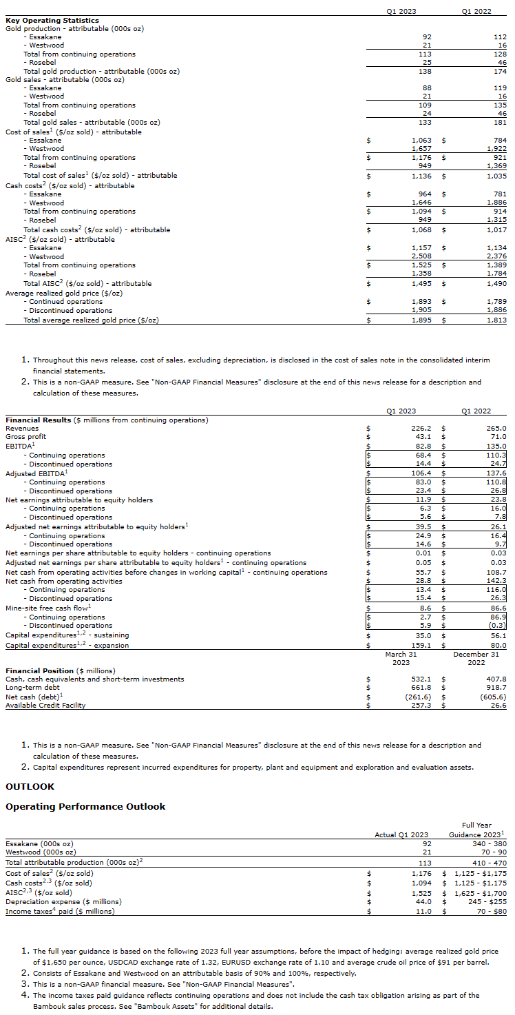 The following tables summarize certain operating and financial results for the three months ended March 31, 2023 (Q1 2023) and March 31, 2022 (Q1 2022) and certain measures of the Company's financial position as at March 31, 2023, December 31, 2022, and March 31, 2022. Financial results of Rosebel include the one month period ended January 31, 2023, prior to the closing of the sale to Zijin.
