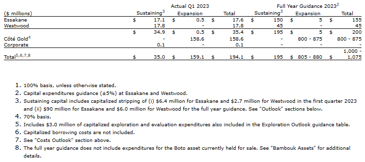 Sustaining capital expenditures Superscript 1 for 2023 are expected to be approximately $195 million (plus or minus 5%) of which the majority is related to capitalized stripping at Essakane (see Operation Section on "Essakane, Burkina Faso") and underground development at Westwood. Expansion capital expenditures Superscript 1 for 2023 are expected to be approximately $805 to $880 million with Cote Gold expenditures, on an incurred basis, expected to be approximately $800 to $875 million, based on IAMGOLD's 70% accounting for Cote Gold (see also "Cote Gold Project"). Other expansion capital expenditures Superscript 1 (excluding Cote Gold) are expected to be approximately $5 million (plus or minus 5%) at Essakane in fulfillment of the relocation commitment to the Essakane village.