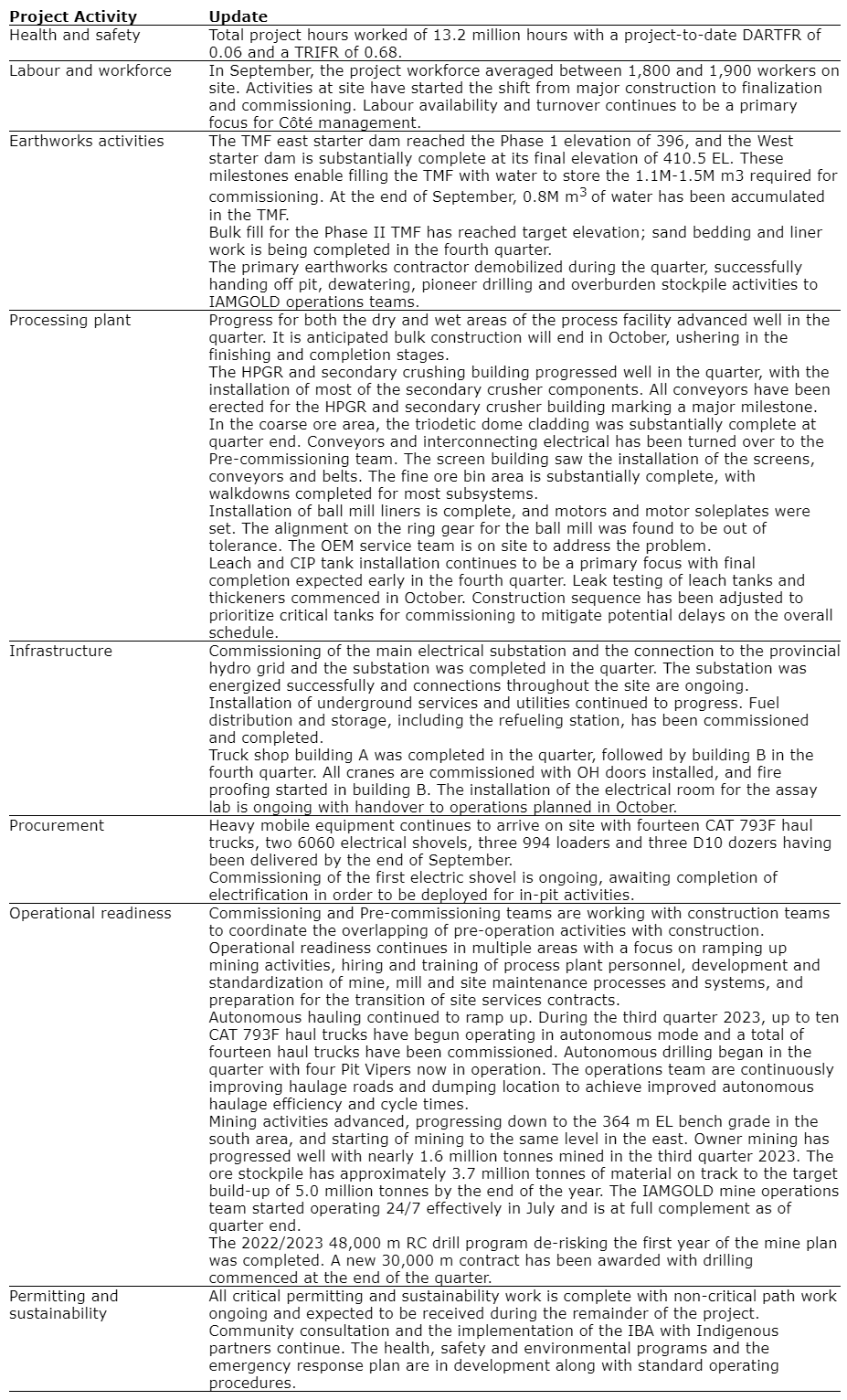 As of Sept. 30, 2023, on an overall project progress basis, Cote Gold was estimated to be 90.6 per cent complete, with construction progress approximately 92 per cent complete. The associated table provides an update on project activities.