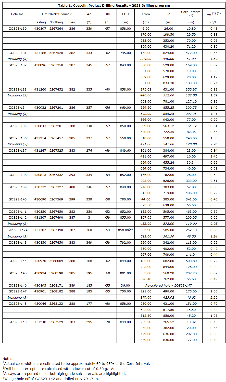 - 472 metres at 0.65 gram per tonne (g/t) gold (Au) in drill hole GOS23-131 from 152 m, including: