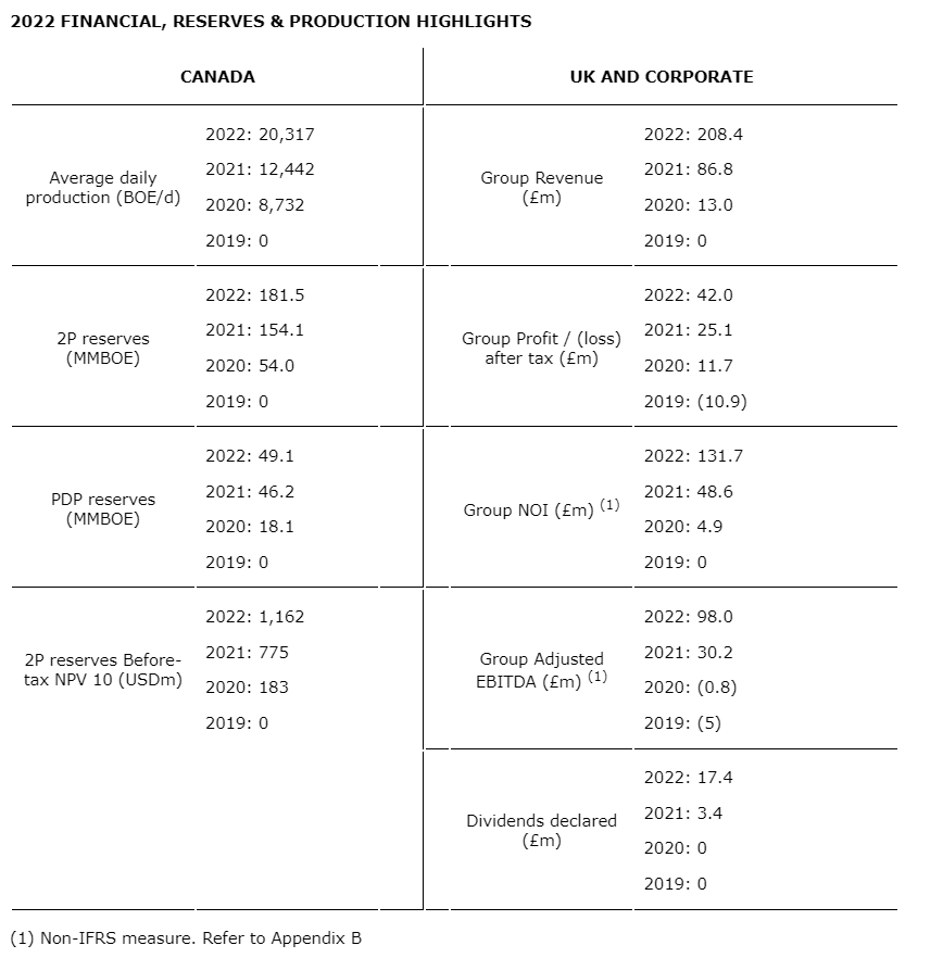 "Two thousand twenty-two also saw the publication of our maiden ESG report and we are very pleased that activities throughout the year saw significant reductions in CO2e emissions as we began to implement methane emission reduction initiatives. We continued to deliver on our total shareholder return model, as we balanced our production growth with increased cash returns to investors with an expanded dividend program which saw over 17.4 million pounds sterling in dividends being declared during the year.