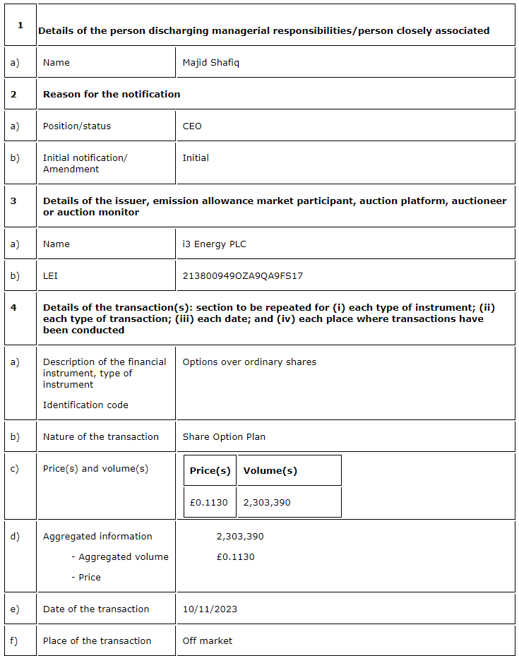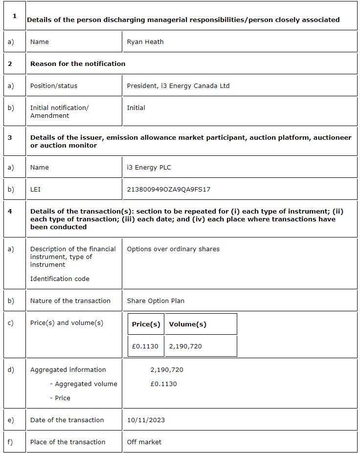 i3 Energy PLC has issued LTIP (long-term incentive plan) awards, in accordance with the rules of the company's share option plan, which include option and cash pool awards. The LTIP awards include options over 18,594,470 ordinary shares to i3 staff and executive board members and an approximate cash pool reward of 1,836,826 British pounds. The exercise price of the options is 11.3 pence per share, being the closing price of the company's shares on AIM (Alternative Investment Market) on Nov. 9, 2023.