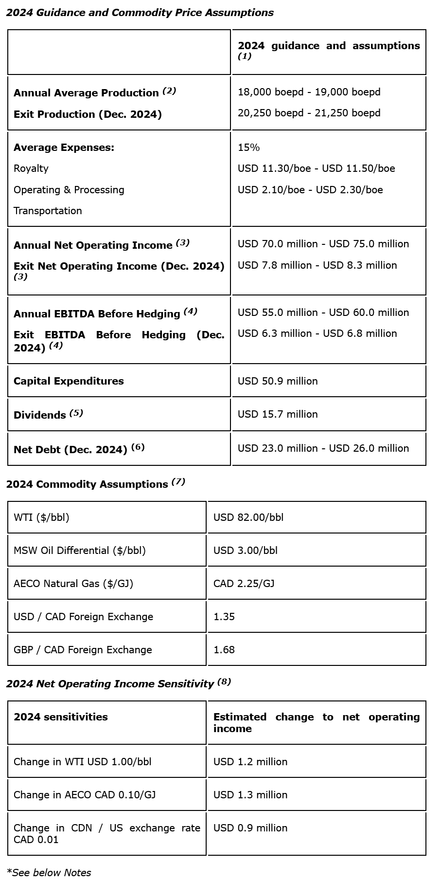 USD 70 - 75 million of 2024 Net Operating Income ("NOI") and USD 55 - 60 million of EBITDA before hedging gains and losses, based on budget price assumptions of USD 82/barrel ("bbl") for WTI and CAD 2.25/Gigajoules ("GJ") for AECO natural gas.