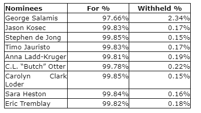 The following individuals were elected as directors for the ensuing year: George Salamis, Jason Kosec, Stephen de Jong, Timo Jauristo, Anna Ladd-Kruger, C.L. (Butch) Otter, Carolyn Clark Loder, Sara Heston and Eric Tremblay.