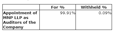 MNP LLP, chartered professional accountants, was appointed as auditor of the company at a remuneration to be fixed by the directors.