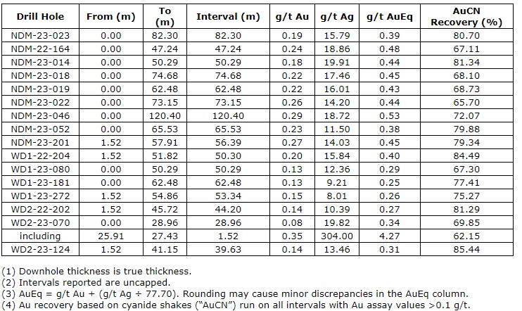 NDM-23-018: 0.22 g/t Au and 17.46 g/t Ag (0.45 g/t AuEq) over 74.68 m;