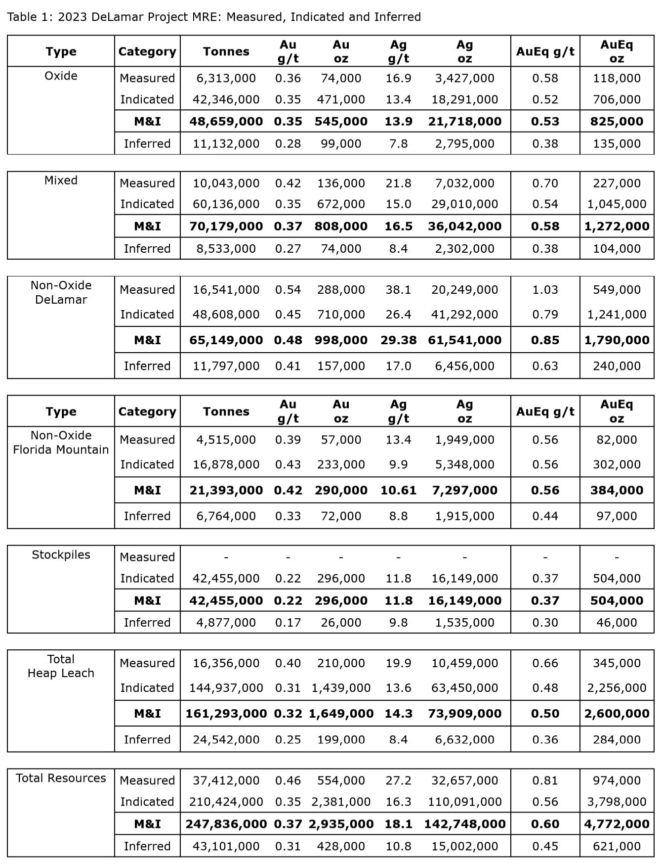 The MRE incorporates the results from the highly successful stockpile drill program completed in April 2023. The stockpile drill program added an Indicated resource of 504,000 ounces ("oz") gold equivalent ("AuEq")1 and an Inferred resource of 46,000 oz AuEq. Subject to further economic studies, the mineralized stockpile and backfill material that was incorporated into the updated MRE demonstrates the potential for this material to significantly increase the heap leach mine life in future production phases. The updated MRE increased the total heap leachable oxide-and-mixed ounces within the Measured and Indicated ("M&I") category by ~25% and increased the total Inferred ounces by ~31%. In total, ~90% of the updated MRE falls within the M&I category, highlighting the quality and scarcity of projects such as DeLamar in the prolific Great Basin mining district of the USA.