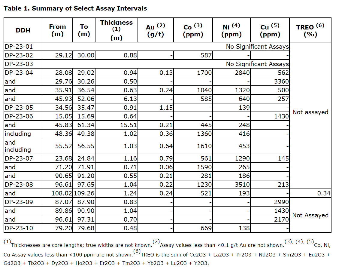 The company followed up on encouraging cobalt and gold values in surface prospecting with 10 shallow diamond drill holes totalling 1,000 metres. The Dorland program is approximately 50 per cent government funded with the support of the Ontario Junior Exploration Program (OJEP). Drill holes intersected alteration and sulphide-breccia-hosted polymetallic mineralization within a steeply south-dipping structural zone. Assays returned grades up to 1,700 parts per million cobalt, 1.15 grams per tonne gold, 3,360 ppm copper, 3,510 ppm nickel and 0.34 per cent TREO (total rare earth oxides). A summary of select assay intervals is provided in an attached table.