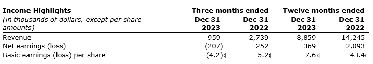For the year ended Dec. 31, 2023, the corporation reported net earnings of $369,000, or 7.6 cents per share, on revenue of $8,859,000 compared with net earnings of $2,093,000, or 43.4 cents per share, on revenue of $14,245,000 for the 2022 fiscal year. For the three months ended Dec. 31, 2023, the corporation reported a net loss of $207,000, or 4.2 cents per share, on revenue of $959,000 compared with net earnings of $252,000, or 5.2 cents per share, on revenue of $2,739,000, for the same period in 2022.