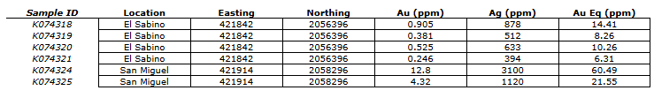 Mr. Lamb commented: "As part of our due diligence into our transaction with Impact Silver, we conducted a site visit. The grades found in the waste piles at the El Sabino and San Miguel mines are highly encouraging, for example, sample K074324 ran 3,100 grams per tonne silver and 12.8 g/t gold. This is 60.49 g/t gold equivalent. Please refer to Table 1 below for our due diligence rock grab results. For obvious reasons, we will be advancing exploration in and around these past-producing mines as soon as possible. Immediate next steps include extensive follow-up mapping, geochemistry and magnetic geophysics. In fact, a second sampling program has already been completed with results pending, and we are currently in discussions with geophysics contractors."