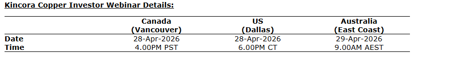 Kincora Copper Ltd. will be holding an investor webinar presentation and discussion on the afternoon of Tuesday, April 28, Pacific Standard Time (PST) and morning of Wednesday, April 29, Australian Eastern Standard Time (AEST).