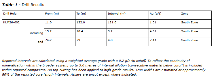 Results from the initial holes of the 2026 drill program, including KLM26-002, confirm broad zones of continuous gold mineralization within the South zone and support the lateral and vertical continuity of the system. Drilling has also begun to test the North zone and deeper targets, including the IP anomaly beneath the South zone, where historical drilling was limited.