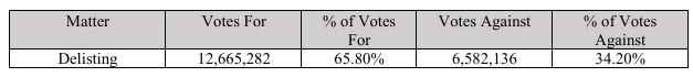 Kermode Resources Ltd. has received the approval of its shareholders of the sole item of business presented at its special meeting of shareholders held today, being the delisting of the company's common shares from the TSX Venture Exchange.