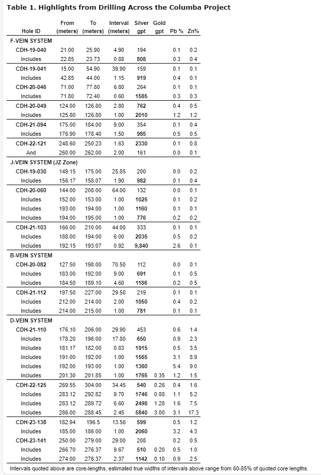 The company has completed over 30,000 metres of diamond drilling in 147 holes at Columba since 2019 and intercepted numerous veins with high silver grades and widths indicating excellent resource potential. Prospective veins on the project are hosted within a volcanic caldera setting, the surface extent of mapped veins measuring roughly four kilometres by three kilometres. Management believes that Columba may be a newly recognized vein district that is nearly entirely preserved from erosion.