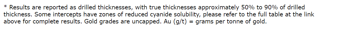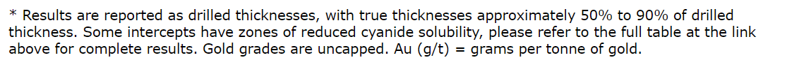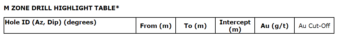 Drill results for an additional eight holes drilled in the M zone have been received. Holes were drilled for infill/resource conversion and to expand mineralization adjacent to the two new discoveries made in the M zone earlier in the year (see press release dated Feb. 21, 2023); two holes were drilled as RC precollars for metallurgical core holes. These results now confirm that the M zone mineralization has a minimum footprint of 800 m long by 400 m wide and remains open to the north and west. Mineralization continues to exhibit gold grades above the resource average, which, combined with its location close to a preferred site for a future heap-leach pad, makes the M zone a strong candidate for early metal production in a future oxide gold mining operation.