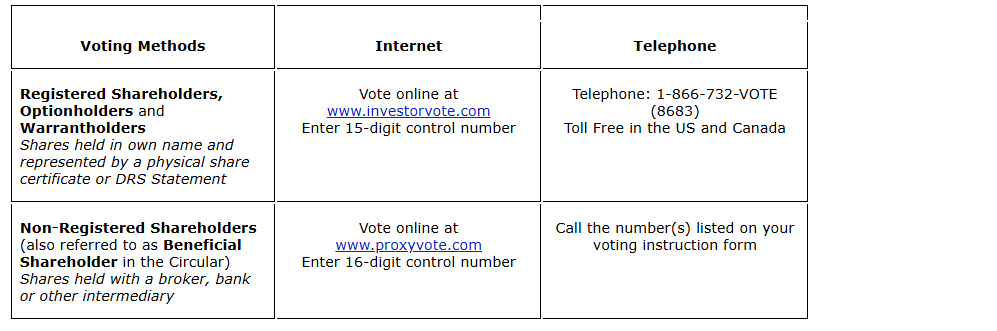 If you hold your securities through a broker, trustee, financial institution or other intermediary, you are a non-registered shareholder and you will receive instructions from such intermediary, or Broadridge Financial Solutions Inc. on the intermediary's behalf, on how to vote your securities. The company has been informed by some securityholders that such meeting materials have been received in their spam or junk e-mail folders. The company wishes to remind securityholders to check their spam or junk e-mail folders and vote their shares.