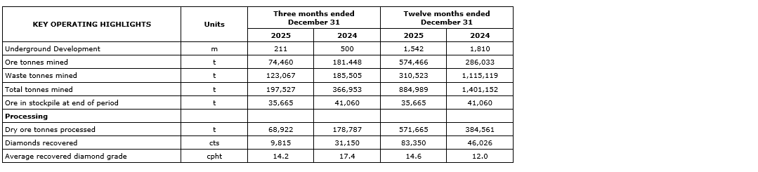 During the FY 2025, 104,508 carats of natural diamonds were sold for revenues of $21,821,275 ($16,405,929 (U.S.)), averaging $209 per carat ($157 (U.S.) per carat). This compares with 29,135 carats sold in FY 2024 for $5,919,820 ($4,652,368 (U.S.)) at an average of $203 per carat ($160 (U.S.) per carat). The company experienced a significant decline in sales revenue during Q4 (fourth quarter) 2025 due to the weakening global diamond market, as well as reduced diamond production due to lower recovered diamond grades as a result of higher dilution by waste rock. The final year-end sale conducted in December, 2025, only achieved an average value of $179 per carat ($136 (U.S.) per carat), representing a significant decline from the previous sale in September, 2025, which resulted in an average unit sales value of $212 per carat ($161 (U.S.) per carat), and well below the mine's historic average unit sales value of $183 (U.S.) per carat. Ken Johnson, president and chief executive officer of Lipari commented that: "The decline in sales revenue experienced during the last three financial quarters of 2025 reflects the global impact that the United States tariffs has had on the natural diamond industry. India manufactures over 90 per cent of the world's natural diamonds and the United States accounts for approximately 55 per cent of the global diamond jewellery consumption. The 50-per-cent tariff on Indian diamond manufacturers has produced a systemic impact across the natural diamond value chain, including mining companies, forcing reduced production, increased inventories and the suspension of operations. Our revenues were also impacted by lower diamond recoveries as a result of dilution of the ore by waste rock. We are evaluating changes to our mine plan to address this problem, which is caused by waste rock from the lower levels of the open pit flowing into the underground draw points."
