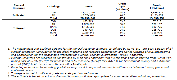 As reported by the company in its press release dated Oct. 31, 2025 (see replicated table below), the Tchiuzo kimberlite contains constrained mineral resources comprising an indicated resource of 28.8 million tonnes containing 13.6 million carats at an estimated diamond grade of 47.2 carats per hundred tonnes, and an inferred resource of 6.5 million tonnes containing 2.0 million carats at an estimated grade of 30.7 carats per hundred tonnes. The mineral resources were estimated based on a bottom-screen cut-off of positive 1.0 millimetre.