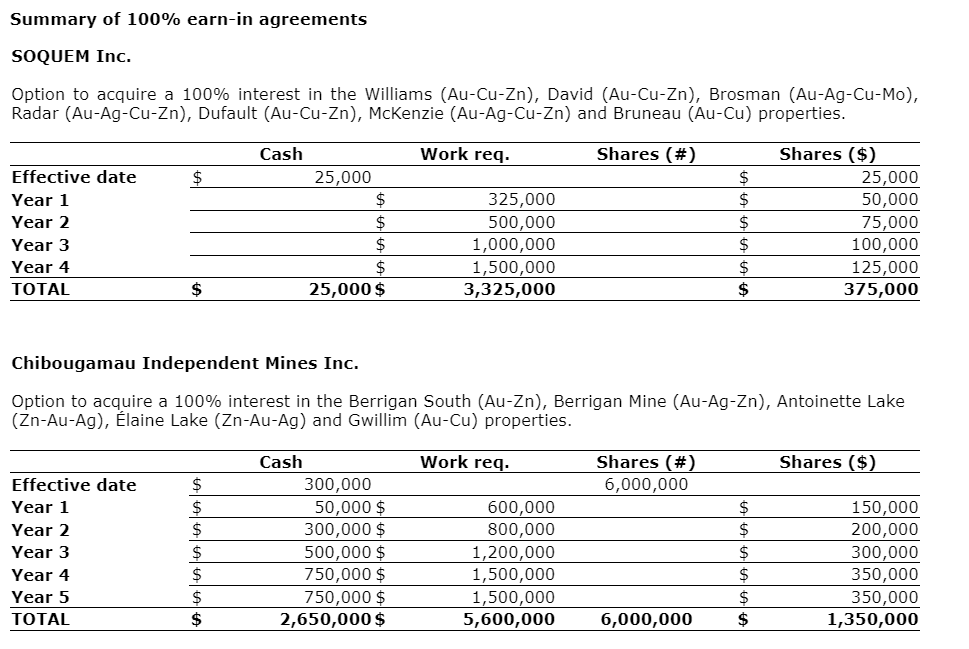 The agreements are subject to regulatory approval. The common shares to be issued in relation with the agreements are subject to a resale restriction period of four months and one day.