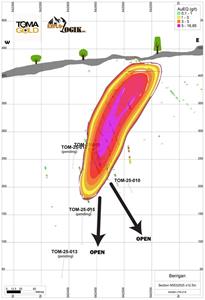 Longitudinal Section of the Berrigan Property Known Mineralized Envelope and Completed Drill Holes (excluding TOM-25-011 and TOM-25-012)