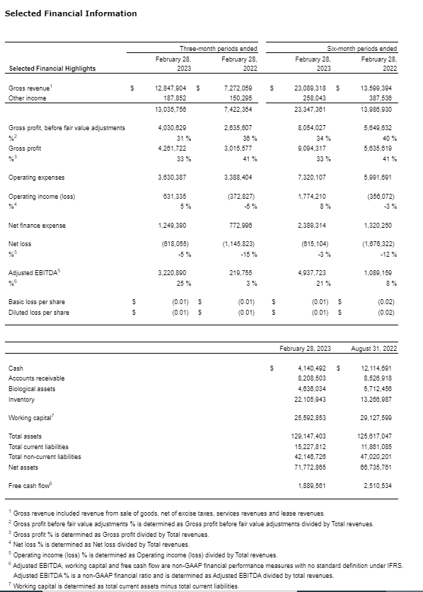 - The company has set an objective by its fiscal year-end, August, 2023, to activate nine growing zones, a 50-per-cent capacity increase at the Valleyfield facility compared with the previous fiscal year-end. Subsequent to quarter-end, the ninth growing zone was activated.