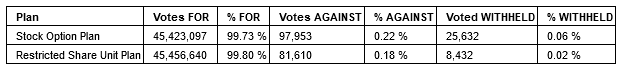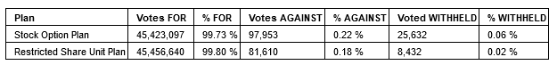 The company's shareholders also approved the company's rolling stock option plan and restricted share unit plan, as is required on an annual basis pursuant to TSX-V policies.