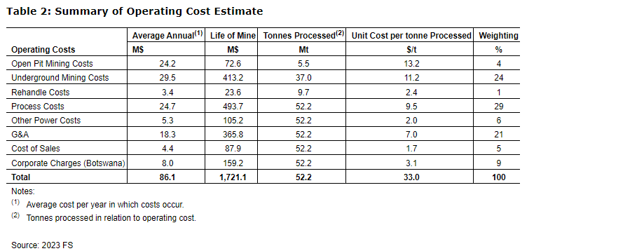 The mine operating cost estimate for the Karowe project is based on a combination of experience, reference projects, first principle calculations, budgetary quotes and factors as appropriate for a FS.