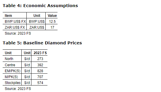 The main assumptions with respect to the economic model are listed in Table 4. Table 5 shows the baseline diamond prices by zone.