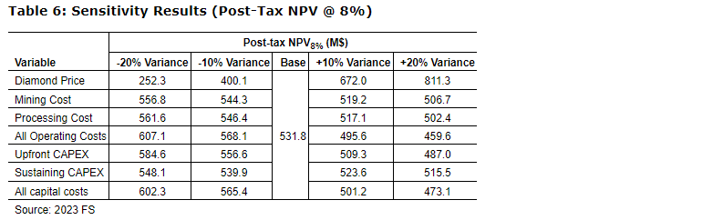• Revised economic modelling with updated diamond prices and exchange rates, exclusion of sunk costs and inclusion of financing costs;